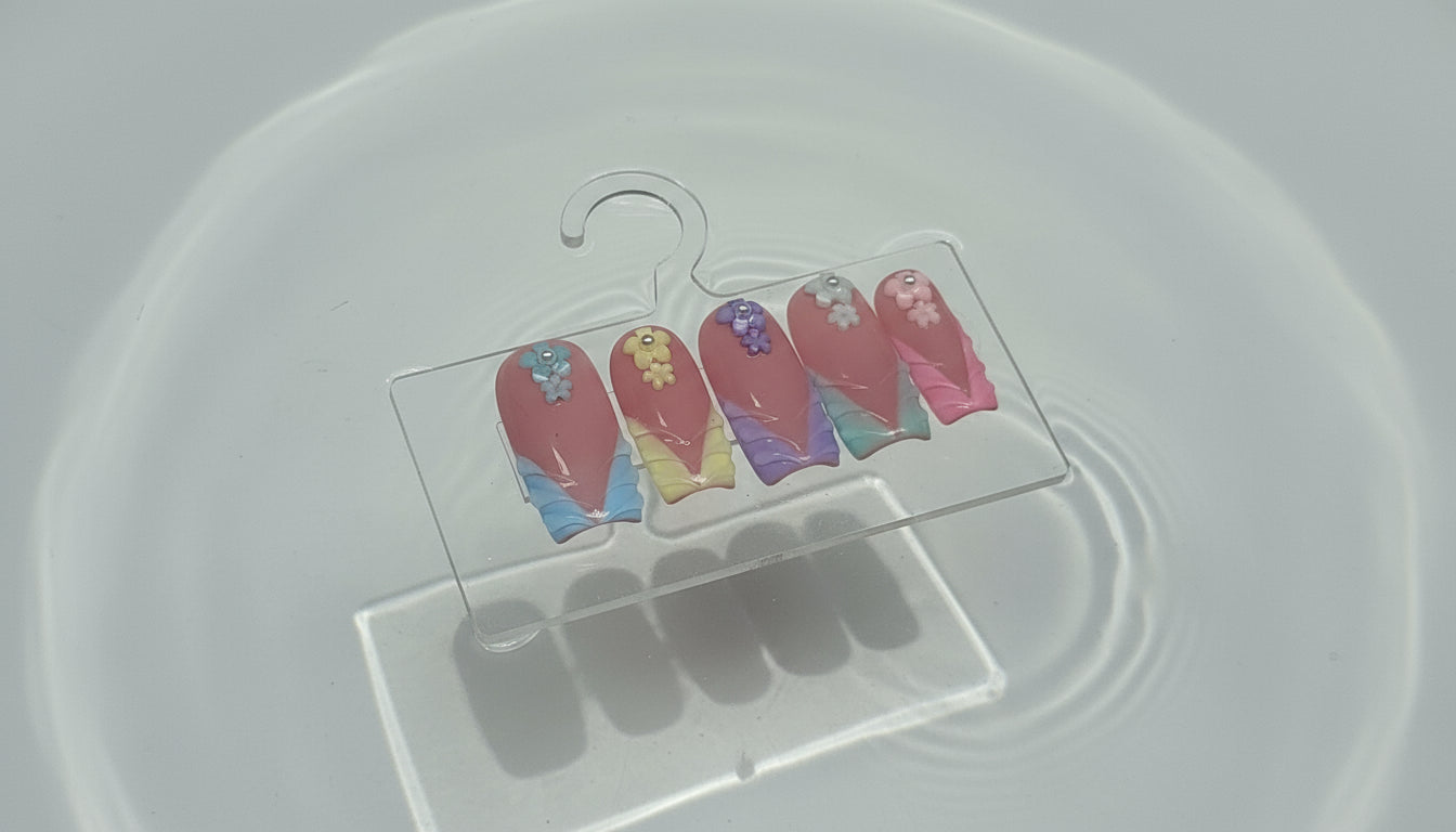 Aloha Spring – Fresh and cheerful, this set features pastel tips with dainty floral accents. Perfect for capturing the carefree joy of springtime blooms and sunny days.