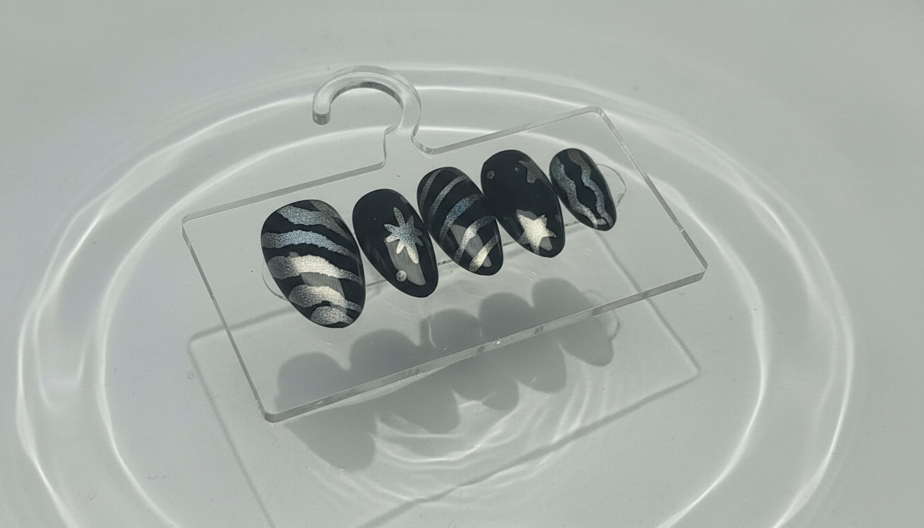 Midnight Stripes – Bold and sleek, this set combines a deep black base with striking silver stripes and stars. Perfect for a night-out statement look with just the right touch of edge and glam.