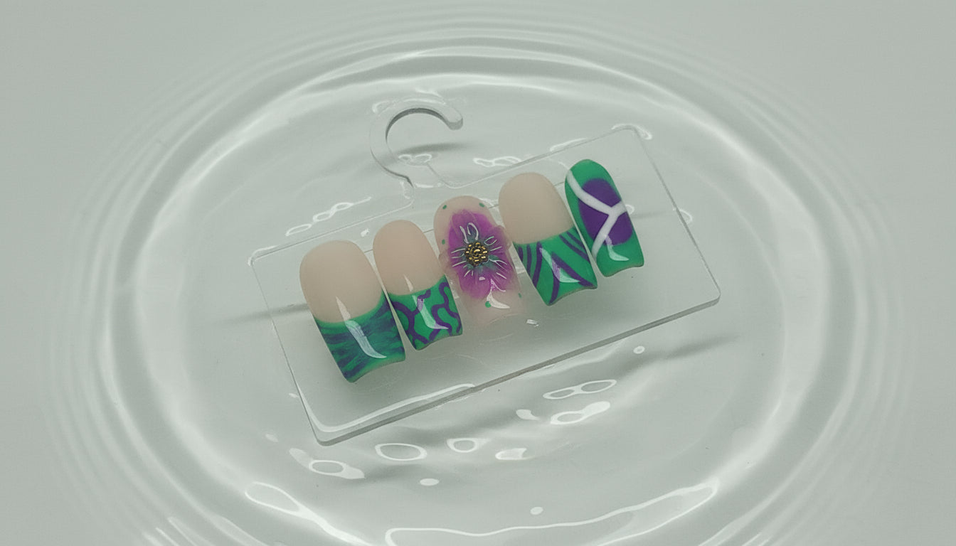 Violet Vines- a bold mix of deep greens, rich purples, and abstract accents topped with a delicate floral charm. This set blends wild energy with a touch of elegance—perfect for anyone who loves a little edge with their beauty.